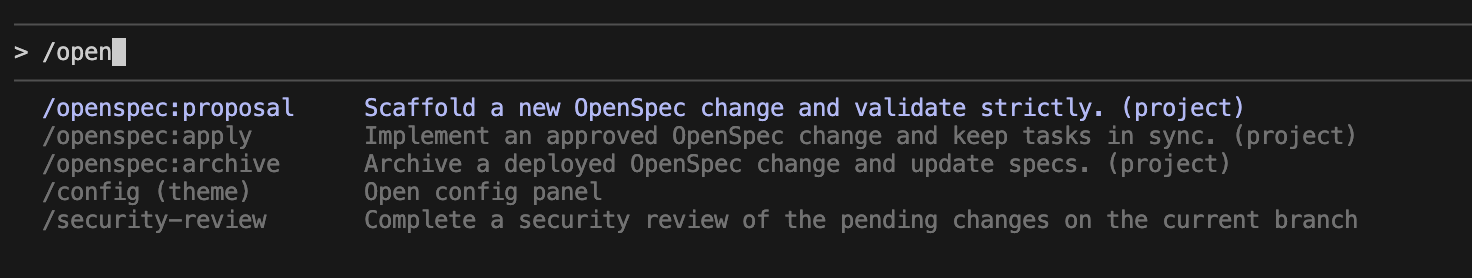 OpenCode | /openspec-proposal, /openspec-apply, /openspec-archive |